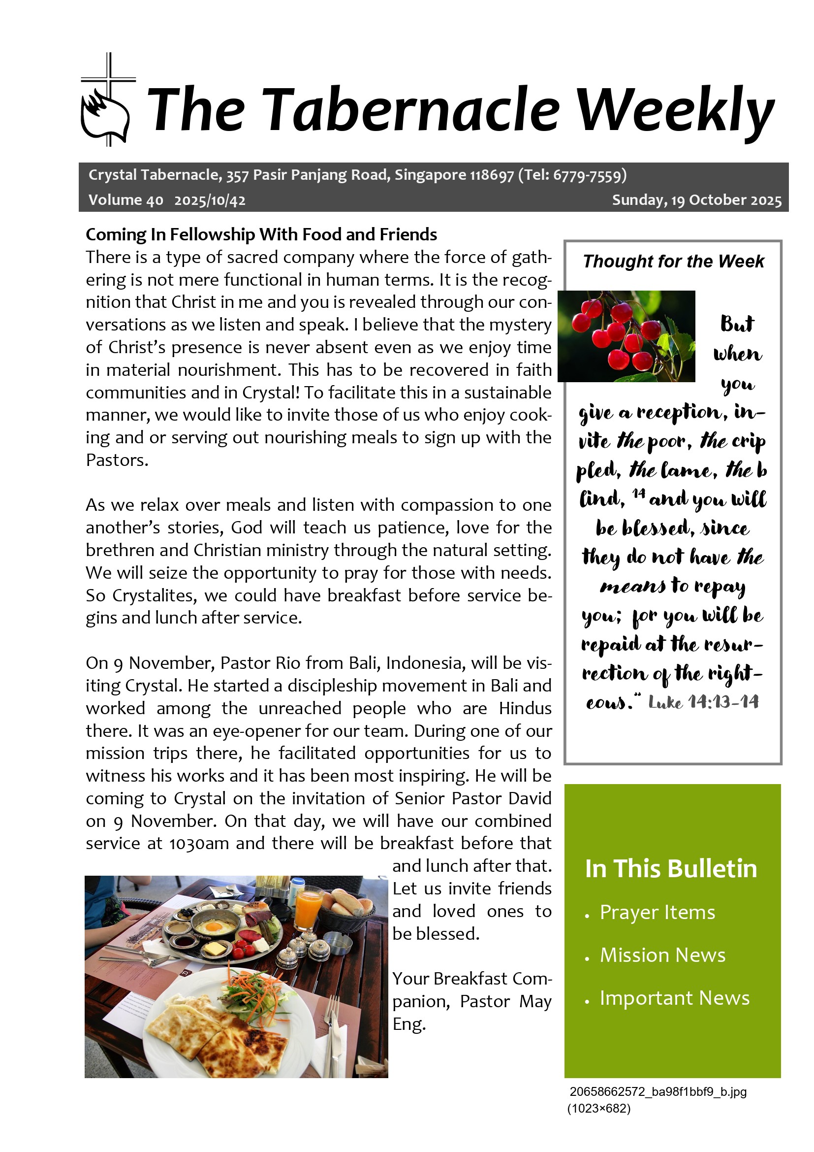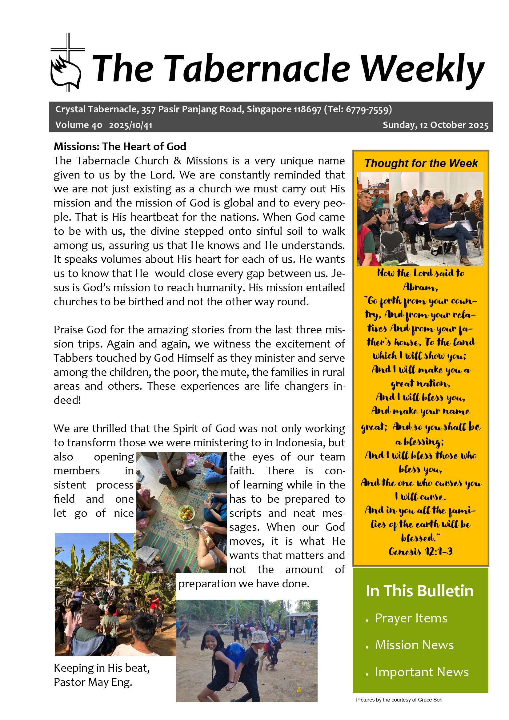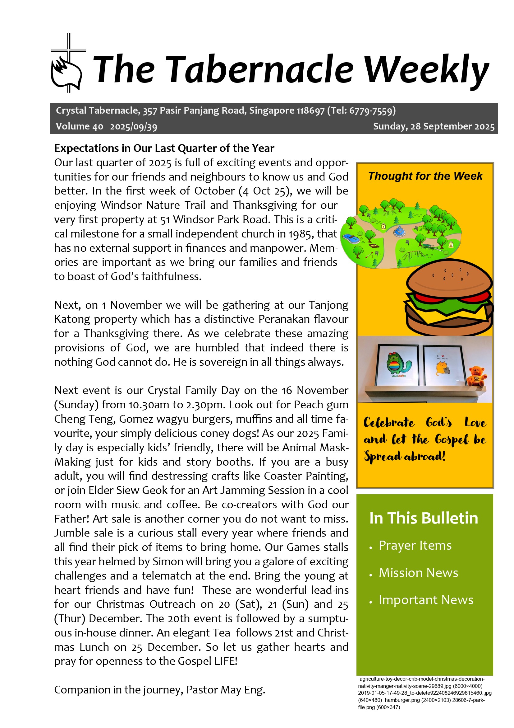 Crystal Tabernacle is a Big Family of God which aspires to live out the love of Jesus holistically by loving and caring genuinely for others. The individuals and families in this church make it uniquely warm and lively.
