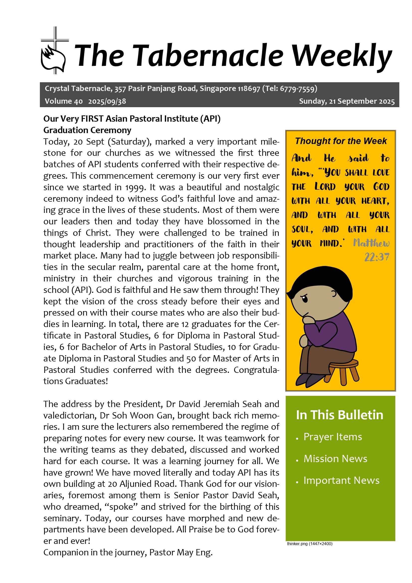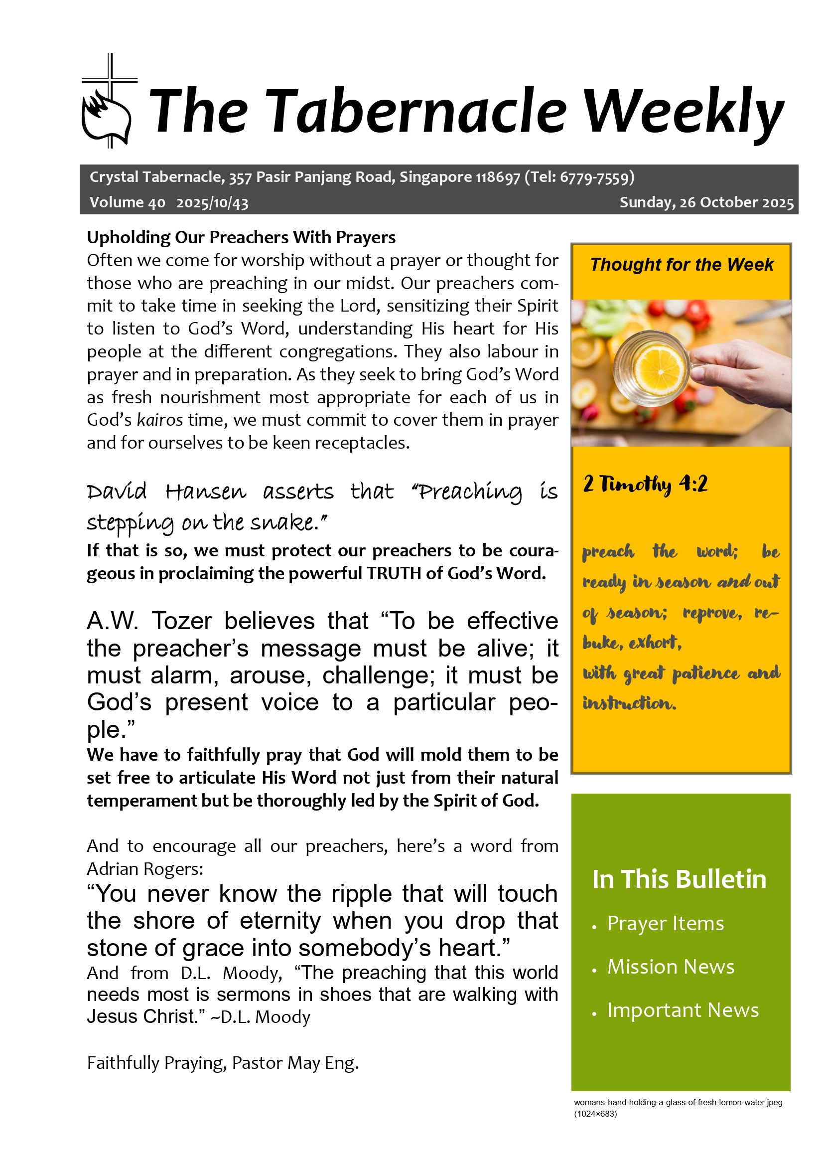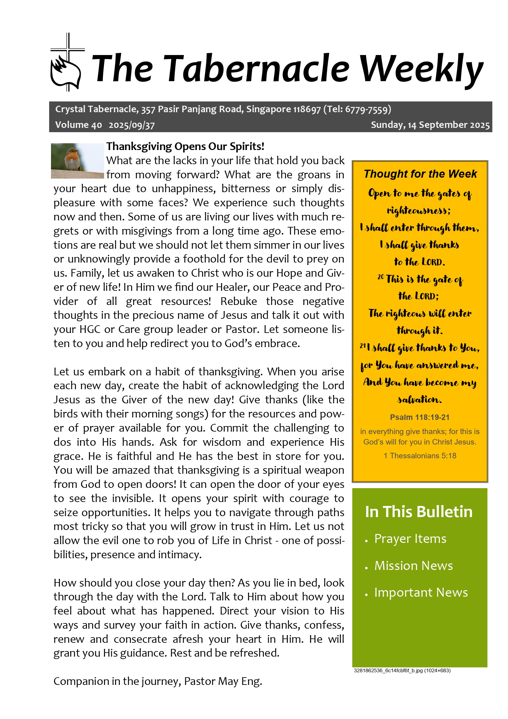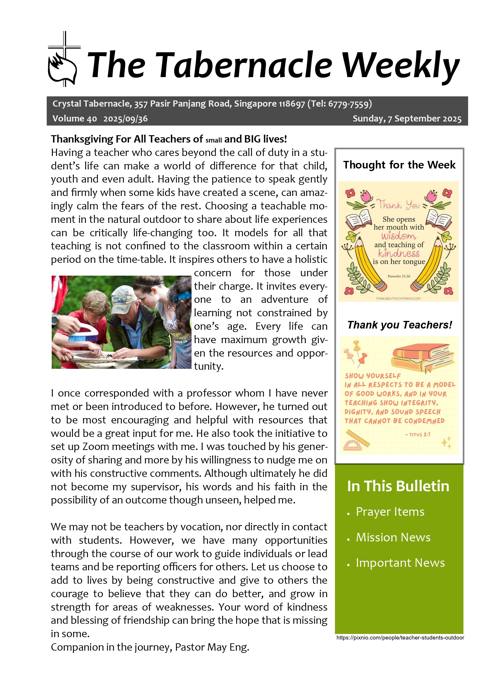 Crystal Tabernacle is a Big Family of God which aspires to live out the love of Jesus holistically by loving and caring genuinely for others. The individuals and families in this church make it uniquely warm and lively.